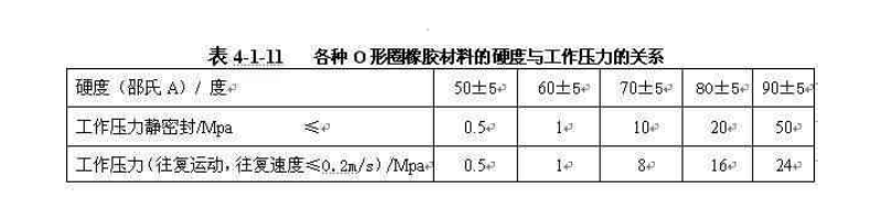 在橡膠材料標準中,以硬度和壓縮永久變形兩項性能Z為主重。選擇壓縮變形較小的橡膠材料對密封性能是有利的,而硬度對于O形橡膠密封圈耐壓和抗擠又是至關重要的。根據G內標準和實踐經驗,橡膠在規定溫度下的壓縮永久變形Z大不超過50%。而橡膠的硬度與密封工作壓力密切相關,壓力越高,硬度也是越高;參見表4-1-11